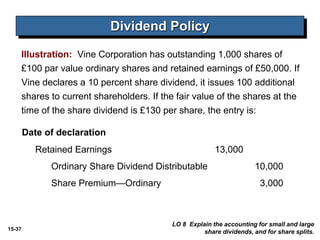 Both cash and stock dividends reduce retained earnings by an amount equal to the size of the distribution. A small stock dividend is viewed by investors as a distribution of the companys earnings. Par value of the dividend C.